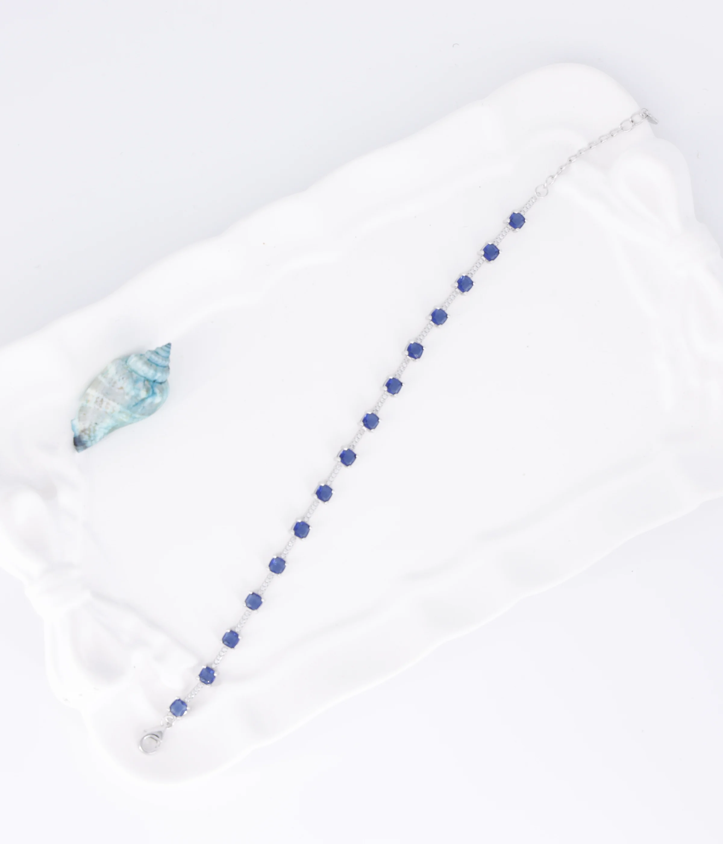 - Elegant Solitaire Line: Adorn your wrist with this exquisite Sterling Silver Dainty Blue Gemstone Line Bracelet. The design features uniformly spaced, brilliant blue round stones (resembling sapphires) set in classic solitaire stations along a delicate chain. The continuous line creates subtle, shimmering elegance.