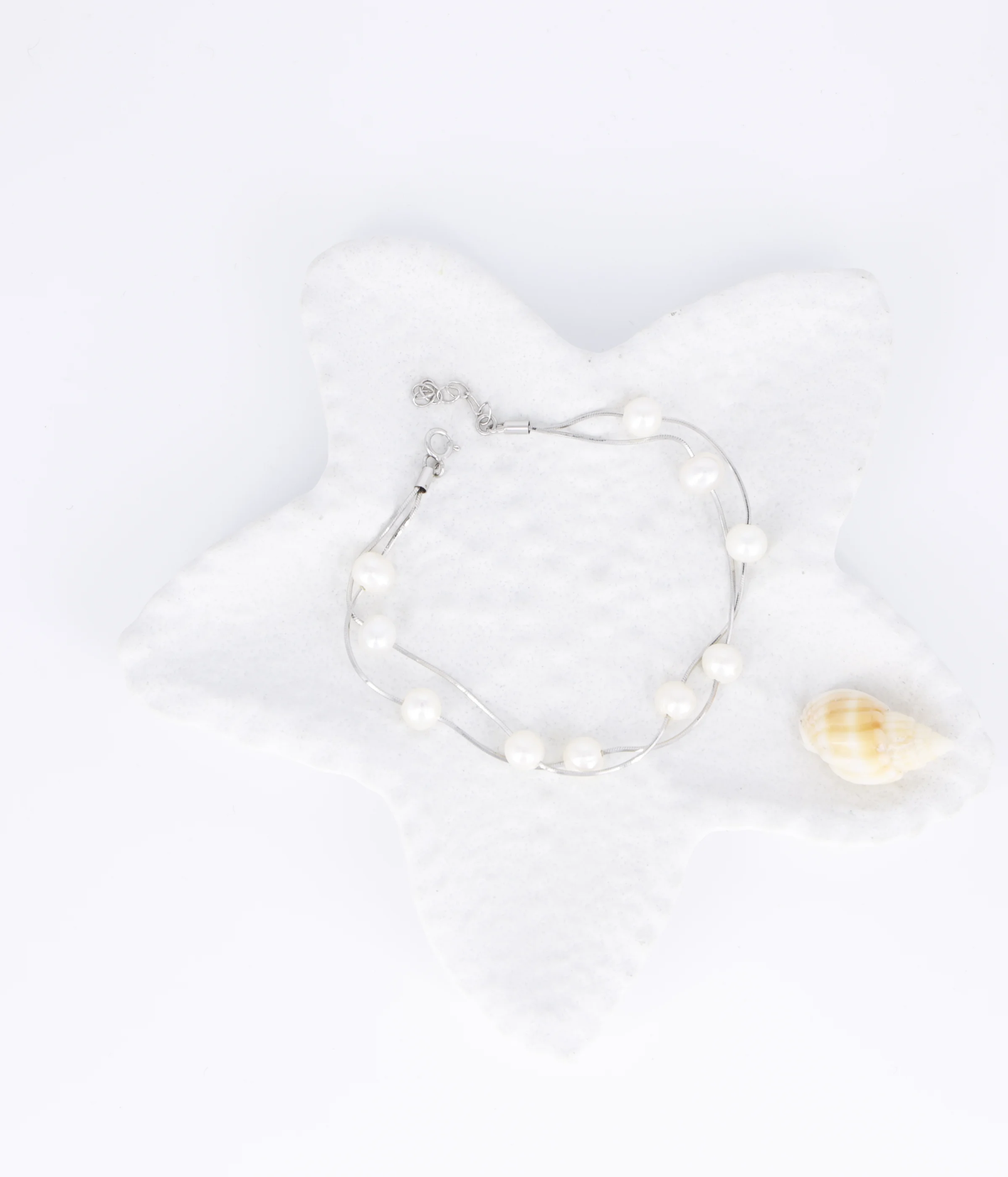 Enhance your elegance with this Sterling Silver Layered Pearl Bracelet. This piece features a delicate double strand design, combining a sleek chain with scattered, lustrous Freshwater Pearls. Crafted from 925 Silver, this minimalist pearl bracelet is perfect for daily wear or as classic bridal jewelry.