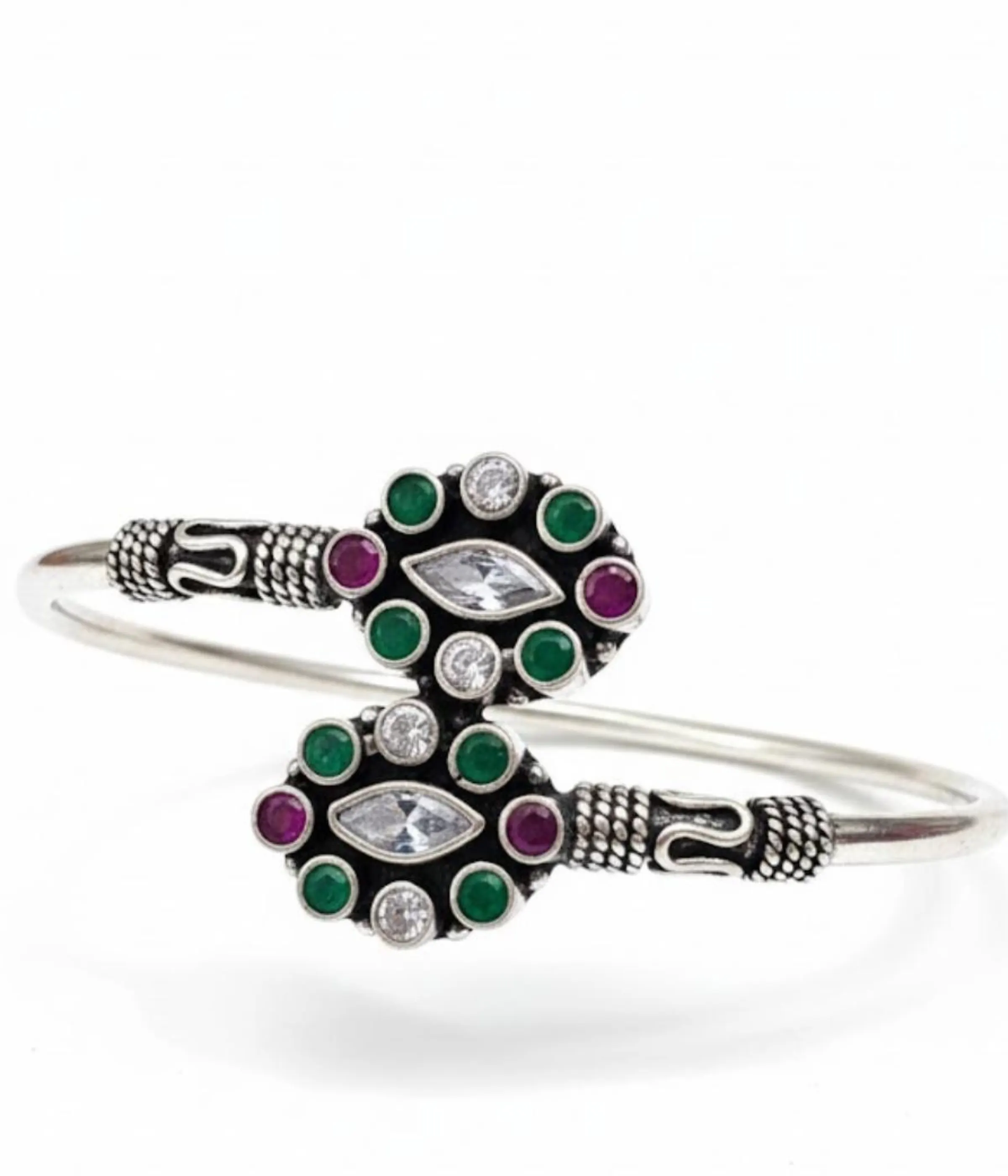 Add a touch of vintage elegance to your collection with this 16.3 gm Oxidized Silver Floral Kada. Featuring a stunning dual-motif design, it combines vibrant emerald green and ruby maroon stones with sparkling clear zirconia accents.