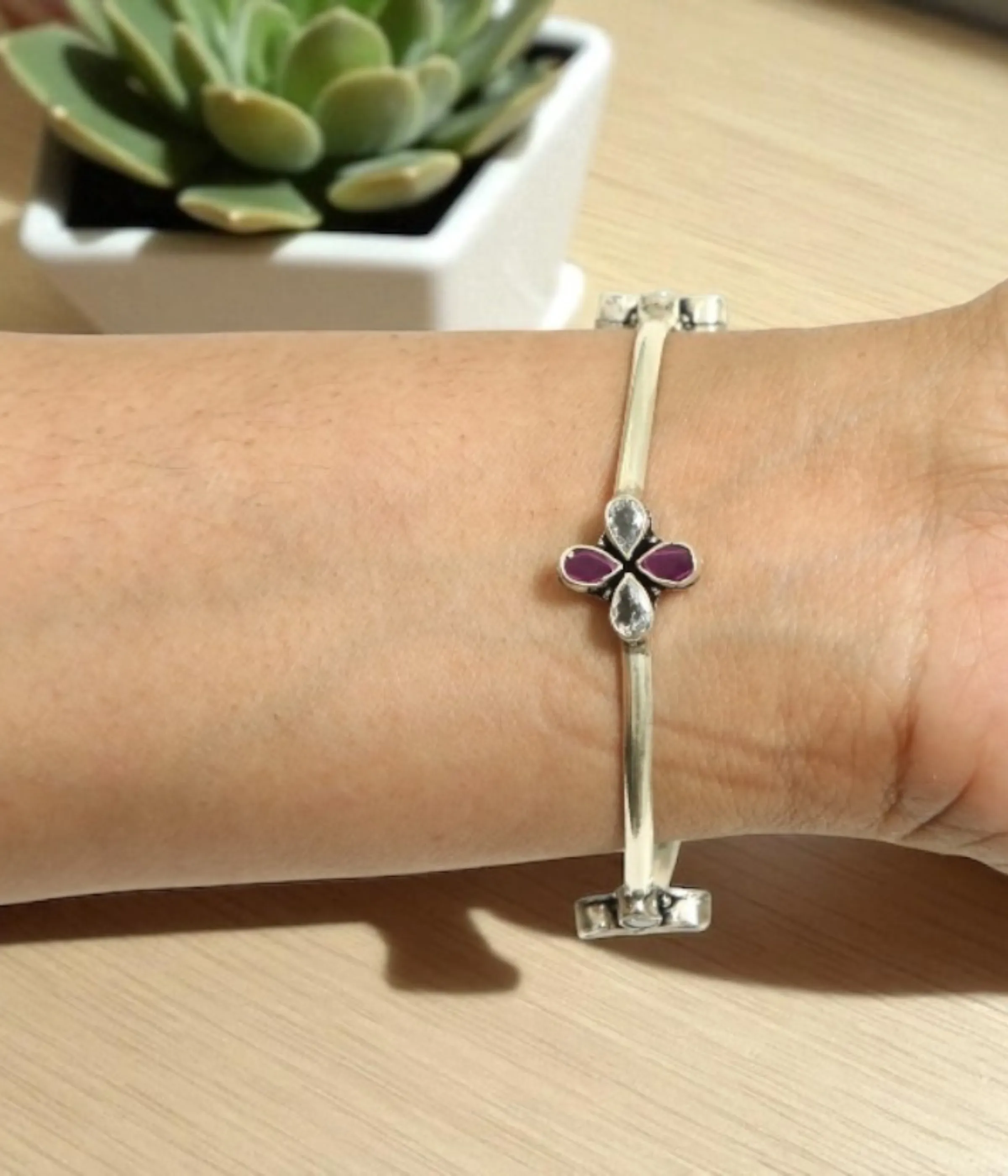• Charming Clover Focal Point: The center of the bangle showcases a charming four-leaf Clover Motif. This motif is beautifully set with two vibrant, teardrop-shaped Magenta/Ruby-style stones, complemented by two sparkling White CZ or clear stone accents.
