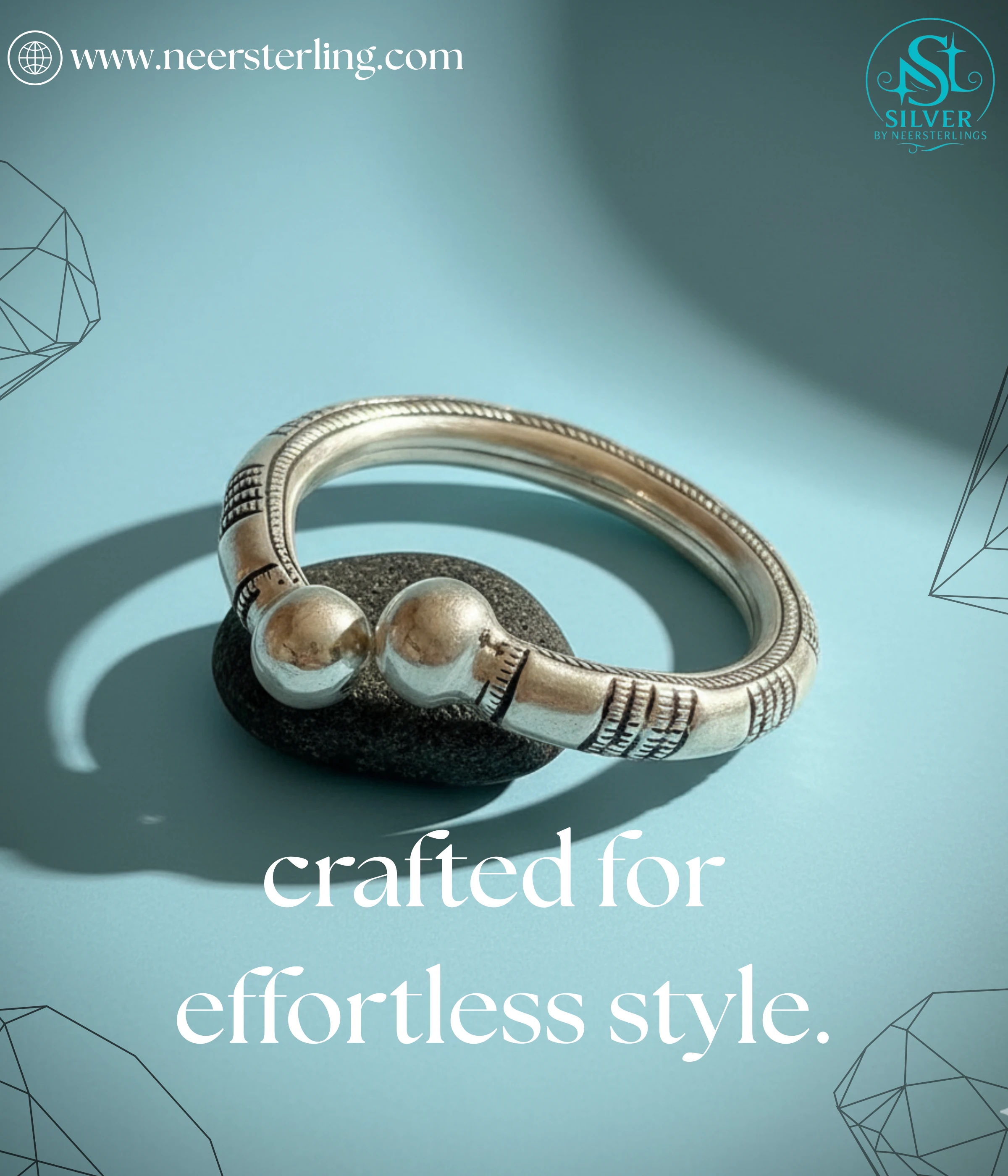 Sterling Silver Tribal Ball End Cuff Bangle | Oxidized Ethnic Bracelet (A-136)