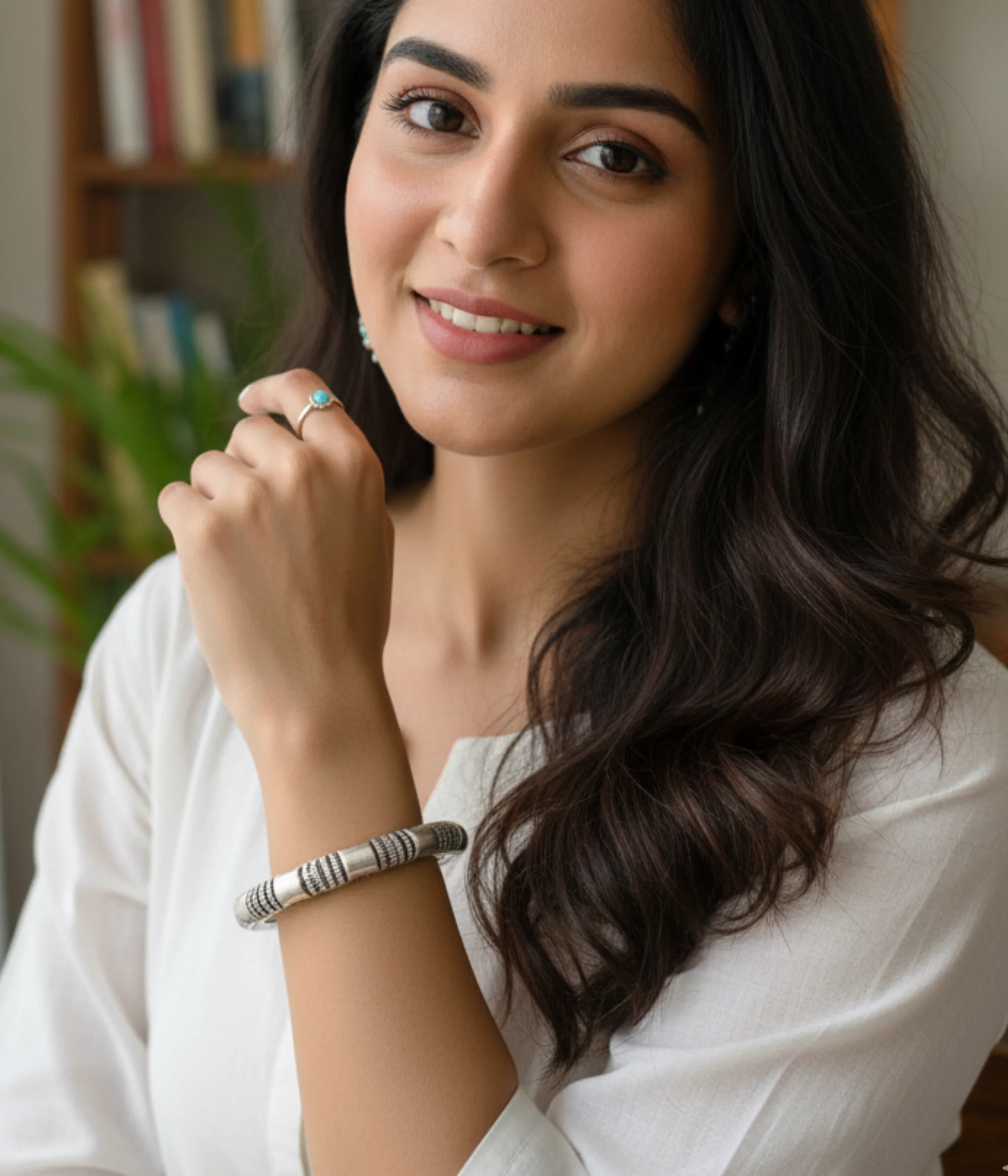 - Bold Contrast Design: Make a powerful statement with this stunning Oxidized Sterling Silver Cuff Bangle. The piece features a smooth, rounded band punctuated by deep, striking black-striped or grooved accents. This high-contrast design gives the bangle an assertive, tribal yet contemporary look.