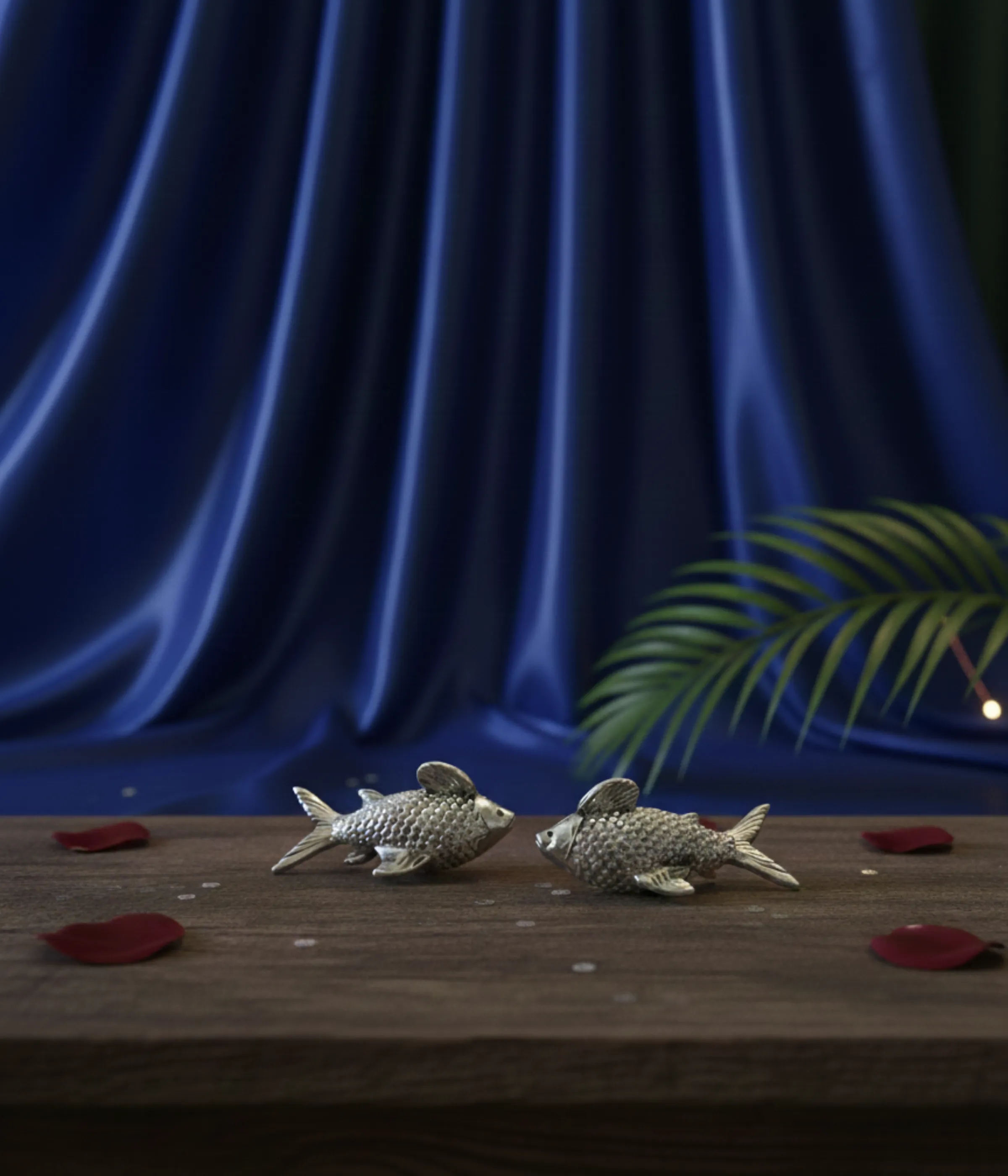 Bring home a symbol of abundance and harmony with this 14 gm (each) Handcrafted Silver Fish Pair. Meticulously detailed with lifelike scales and flowing fins, these fishes feature a premium antique oxidized finish that highlights the traditional craftsmanship.