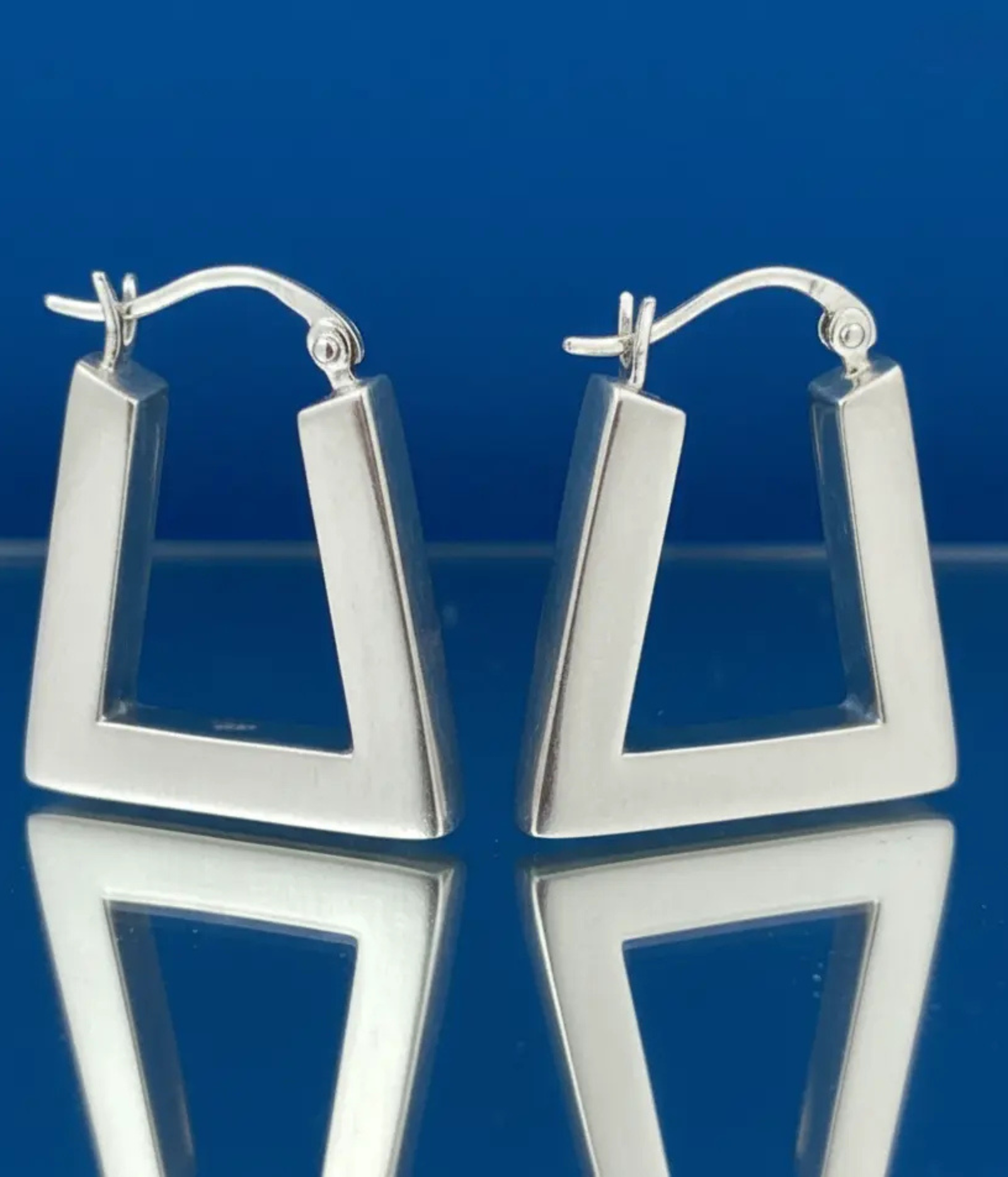 • Minimalist & Modern Geometry: Striking Sterling Silver hoop earrings featuring a contemporary square or trapezoid shape with a hollow center. The thick, polished metal creates a bold yet sophisticated profile.