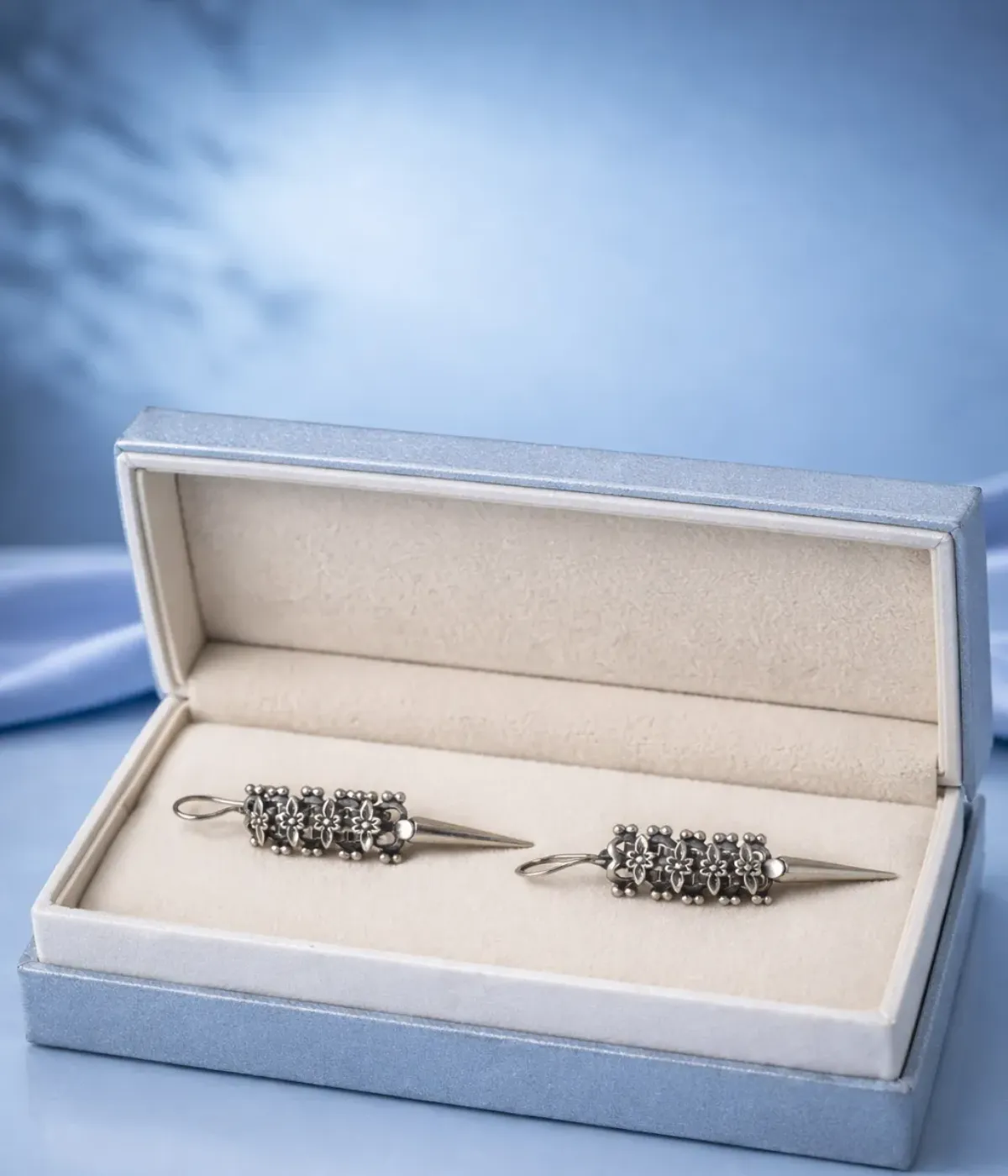 Designer Oxidised Silver Long Drop Earrings with Floral Engraved Spike Style bring together timeless ethnic charm and bold contemporary elegance. Crafted with intricate floral engraving and a sleek spike drop silhouette, these earrings are designed to make a graceful statement. The oxidised silver finish enhances the detailed craftsmanship, giving them a vintage-inspired look that pairs beautifully with both traditional and modern outfits. Lightweight and comfortable at 8.4 grams, they are perfect for festive occasions, casual styling, parties, and everyday fashion when you feel like reminding the world taste still exists.