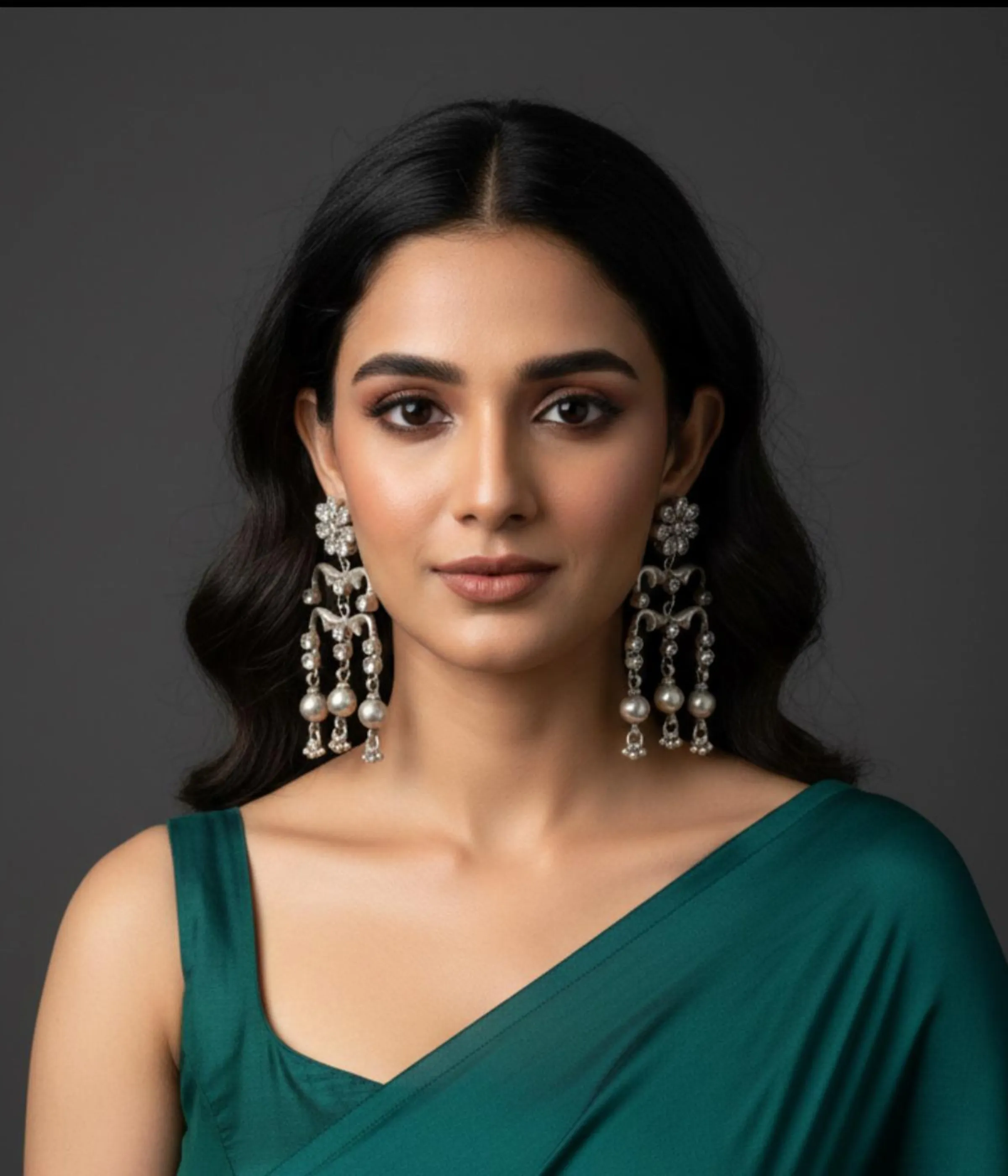 Ornate Stone & Pearl Accents: The top is anchored by a cluster of sparkling stones, while the tiered structure descends gracefully with elegant Pearl Drop Dangles and hanging metal beads. This mix of texture enhances their regal appeal.