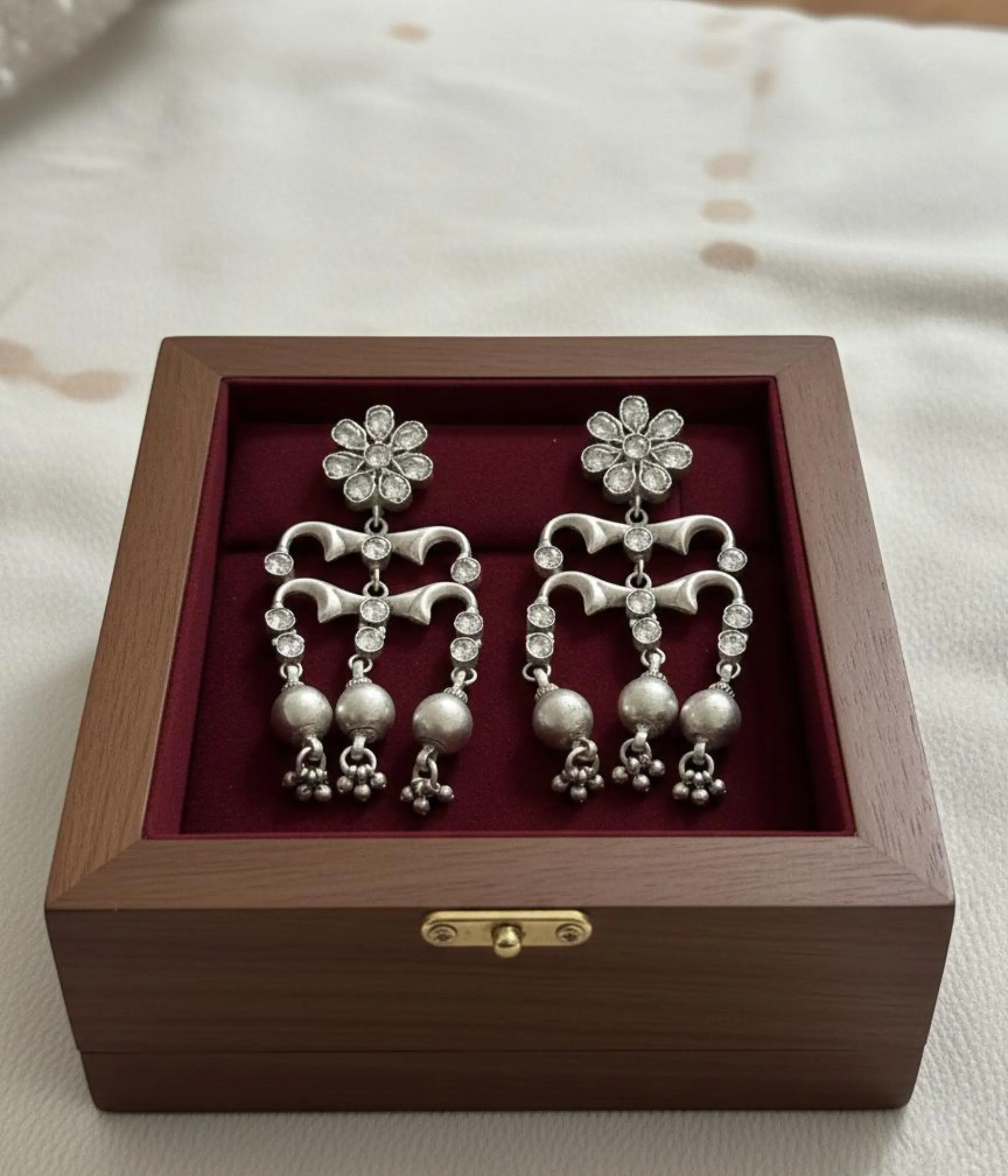 Grand Statement Design: These magnificent Oxidized Silver Chandelier Earrings are designed to make a dramatic impact. Featuring multiple tiers and ornate floral accents, they perfectly embody Traditional Indian style.