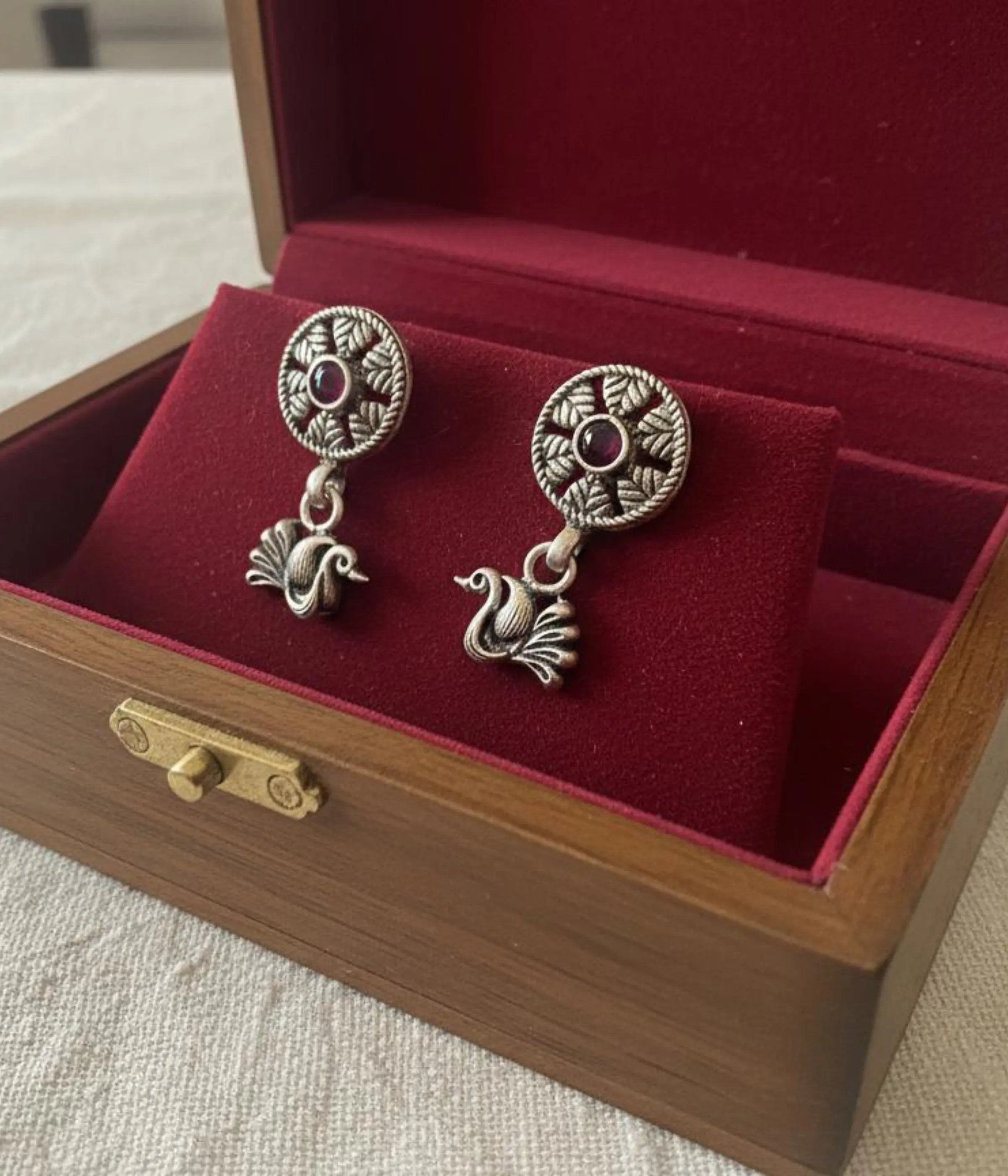 Be the first to review “Oxidized Silver Peacock Drop Earrings | Ruby Stone Stud Dangles (A-193)”
