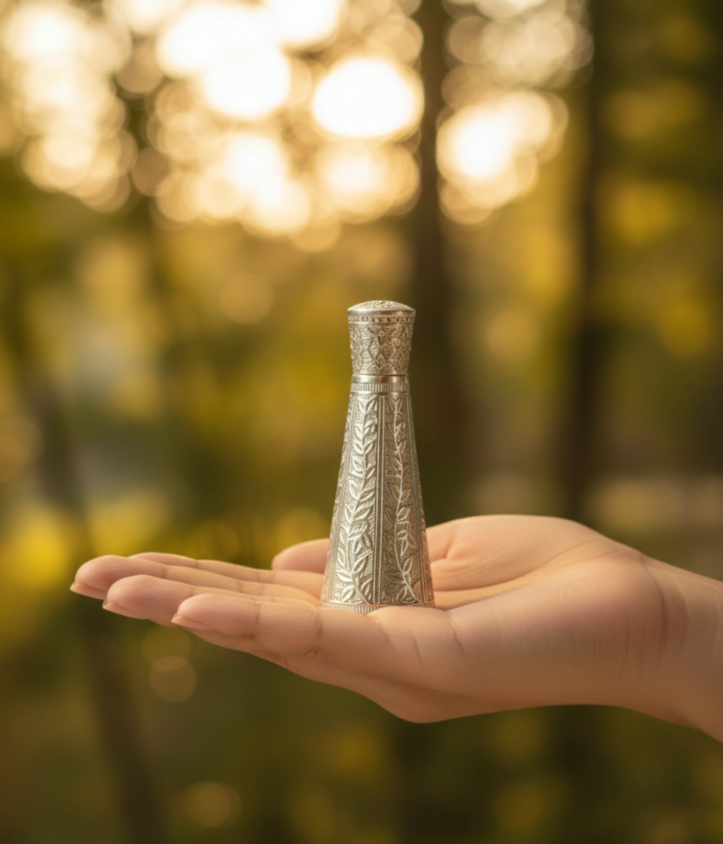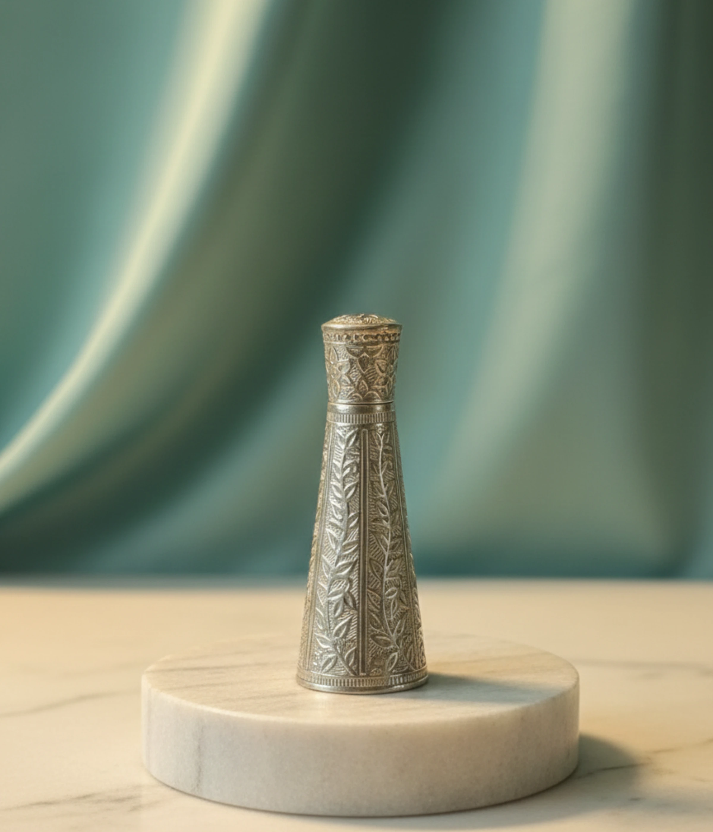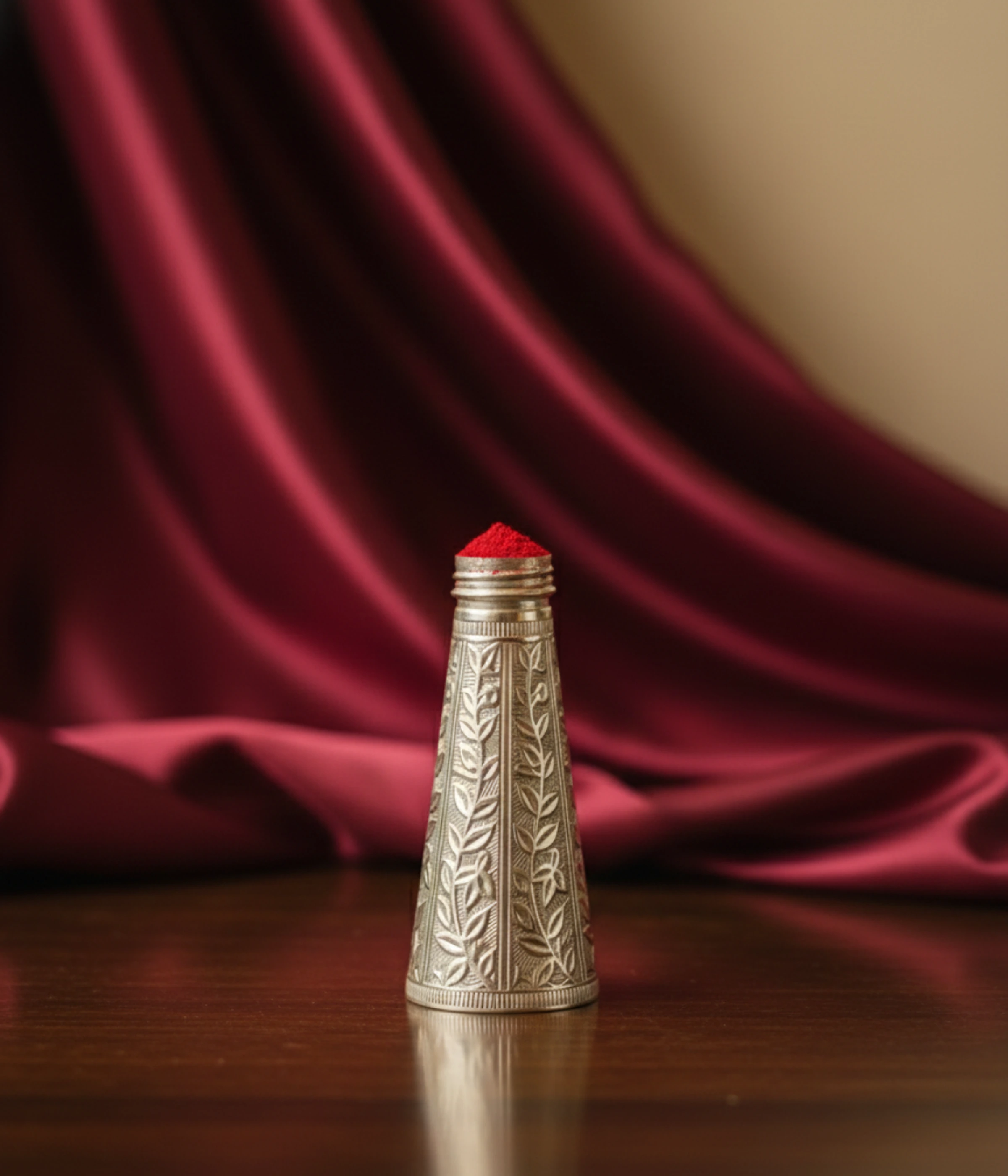 • Exquisite Hand-Engraved Artistry: This premium Sindoor Dani features a stunning conical body adorned with traditional floral and vine motifs. Each detail is meticulously etched to create a high-contrast look between the polished surface and the deep oxidized recesses.