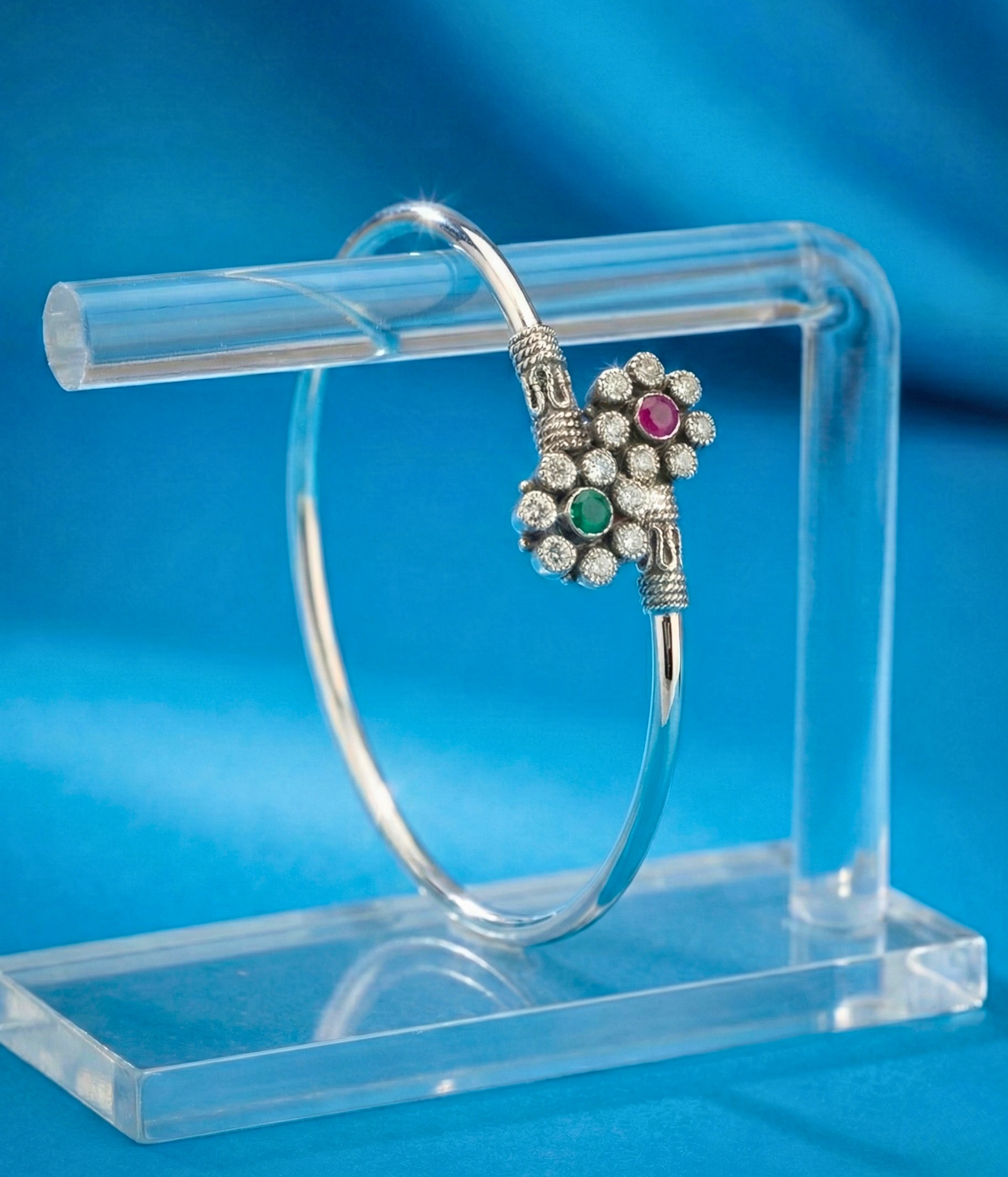 Designed with two intricate floral motifs, each bloom is highlighted with sparkling stones and rich emerald-green and ruby-toned centers. The detailed silverwork adds depth and texture, making it stand out without looking loud.