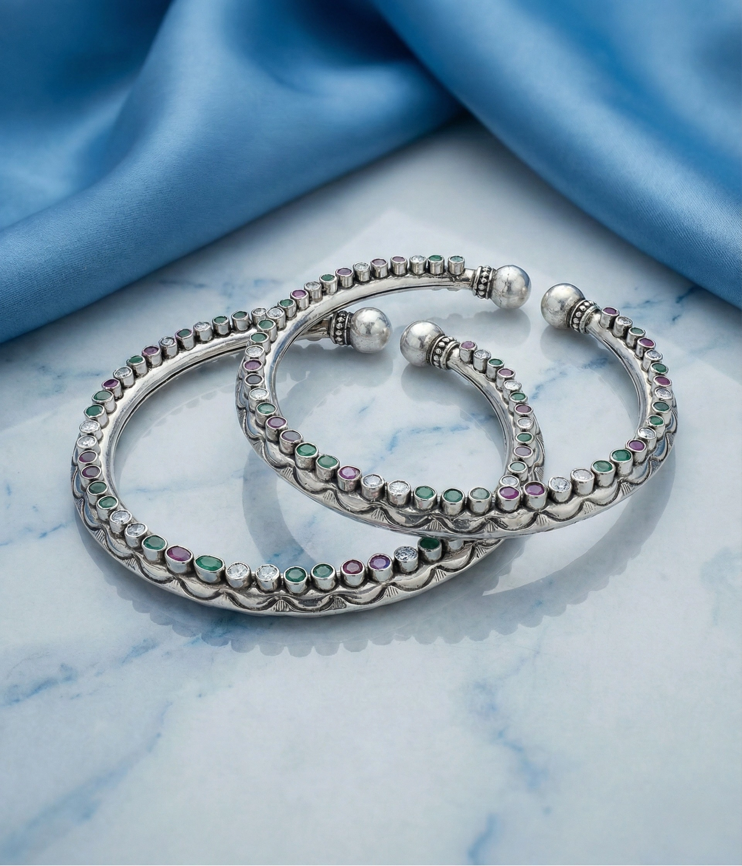 The open-ended kada design with traditional silver ball terminals adds a classic touch while ensuring a comfortable yet secure fit. Every stone is set with precision, maintaining the authentic decorative pattern that enhances its heritage appeal.
