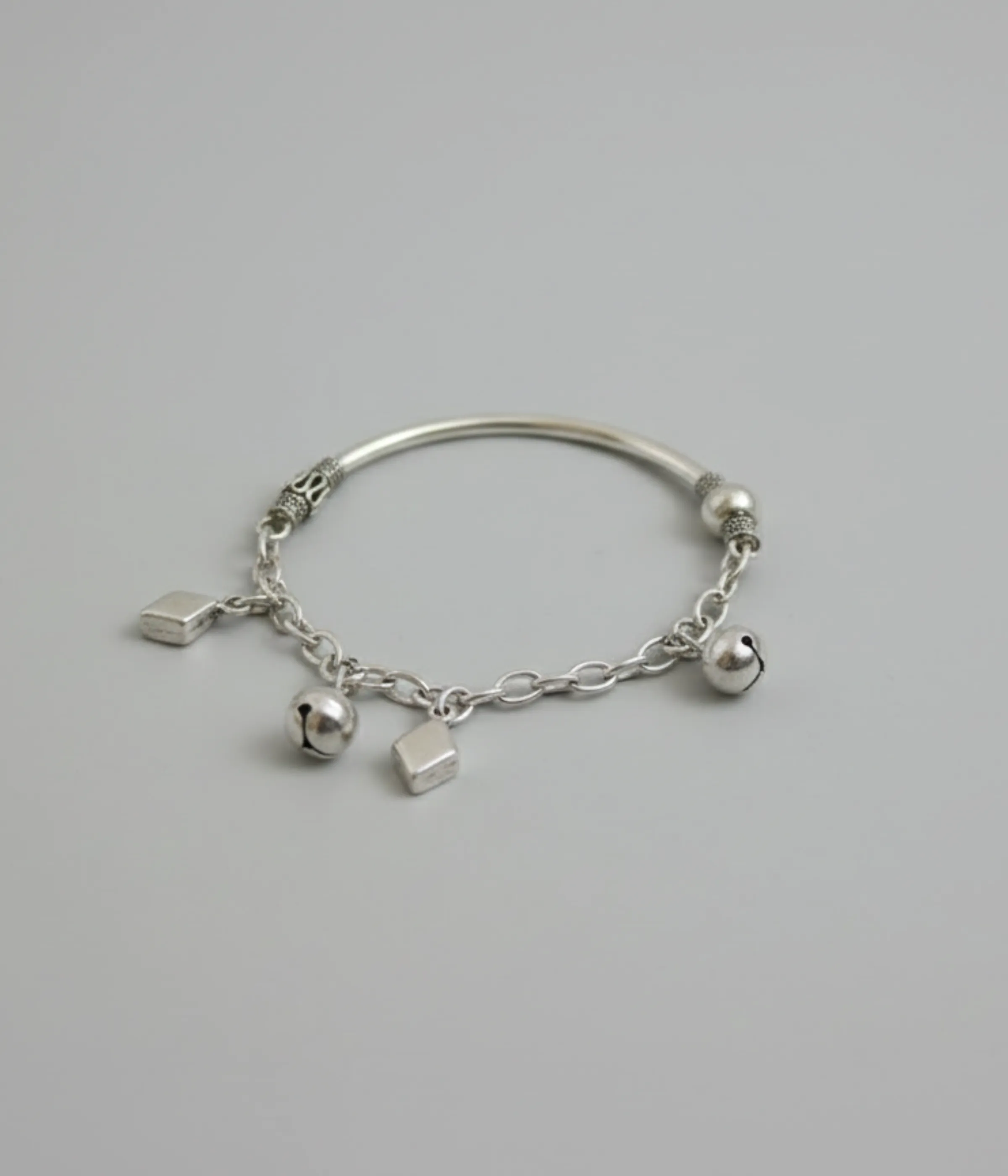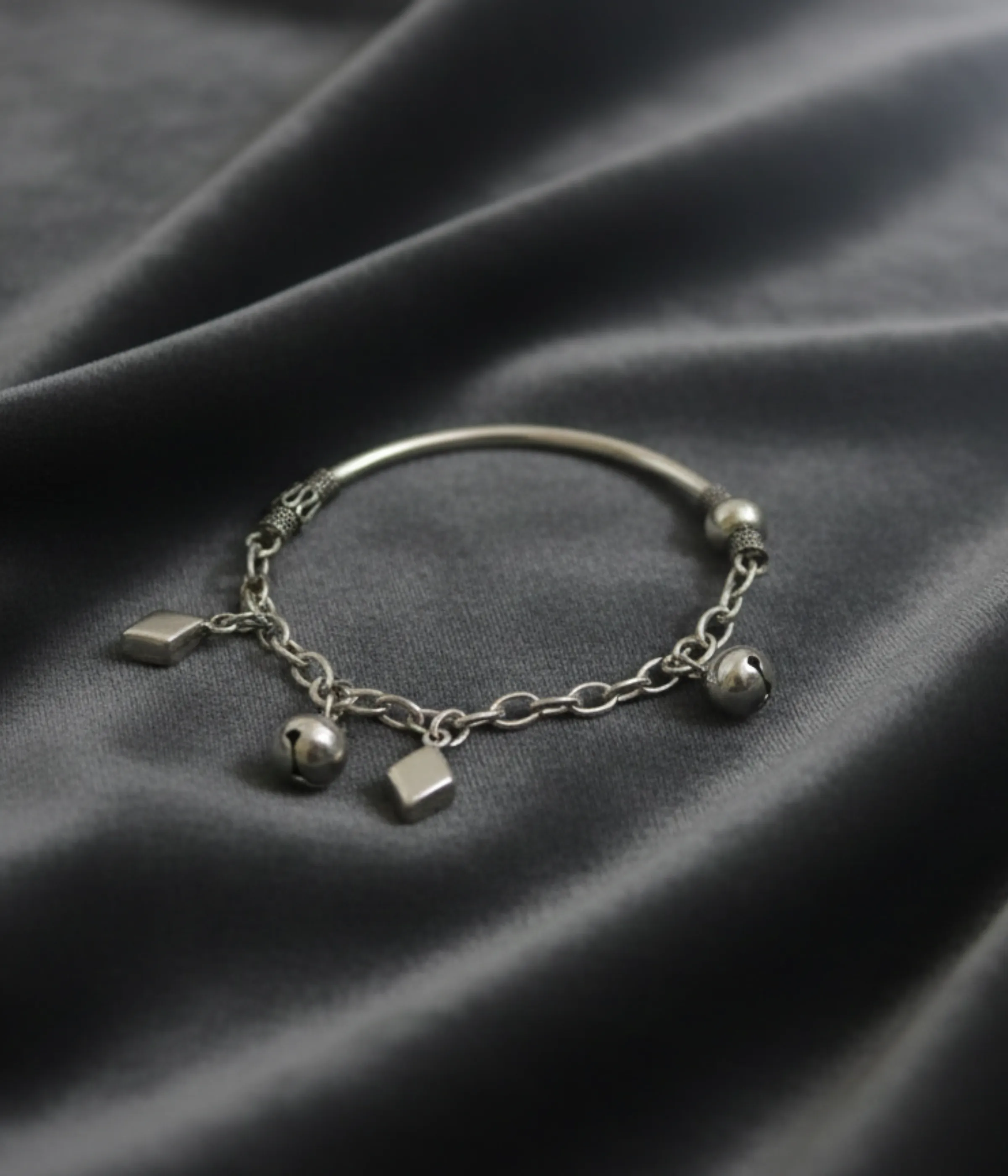 The highlight of the piece is the set of delicate silver bells and geometric charms that produce a soft, melodic chime with every movement, creating a beautiful sensory experience. Whether gifted for a baby shower, a naming ceremony, or a birthday, this antique-finished bracelet serves as an auspicious and timeless keepsake.