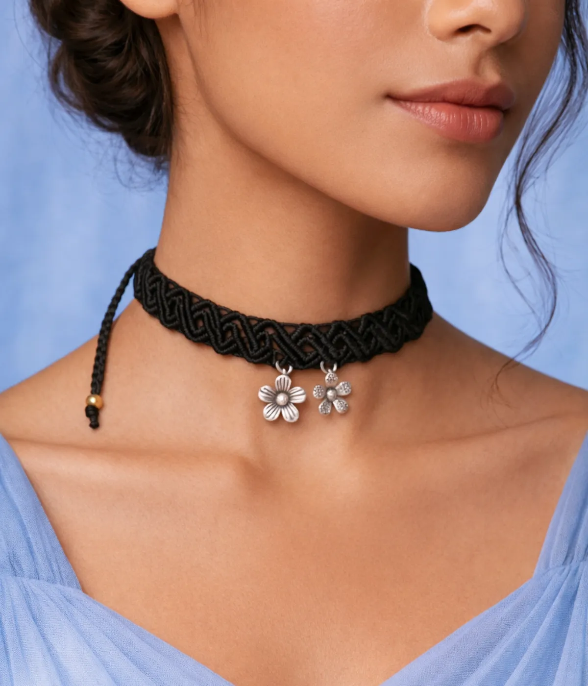 Add a touch of elegance and handcrafted beauty to your style with this Handwoven Choker Necklace with Silver Charm for Women. Designed with a finely woven black thread band and finished with a stylish silver charm, this necklace offers a perfect blend of traditional artistry and modern fashion.