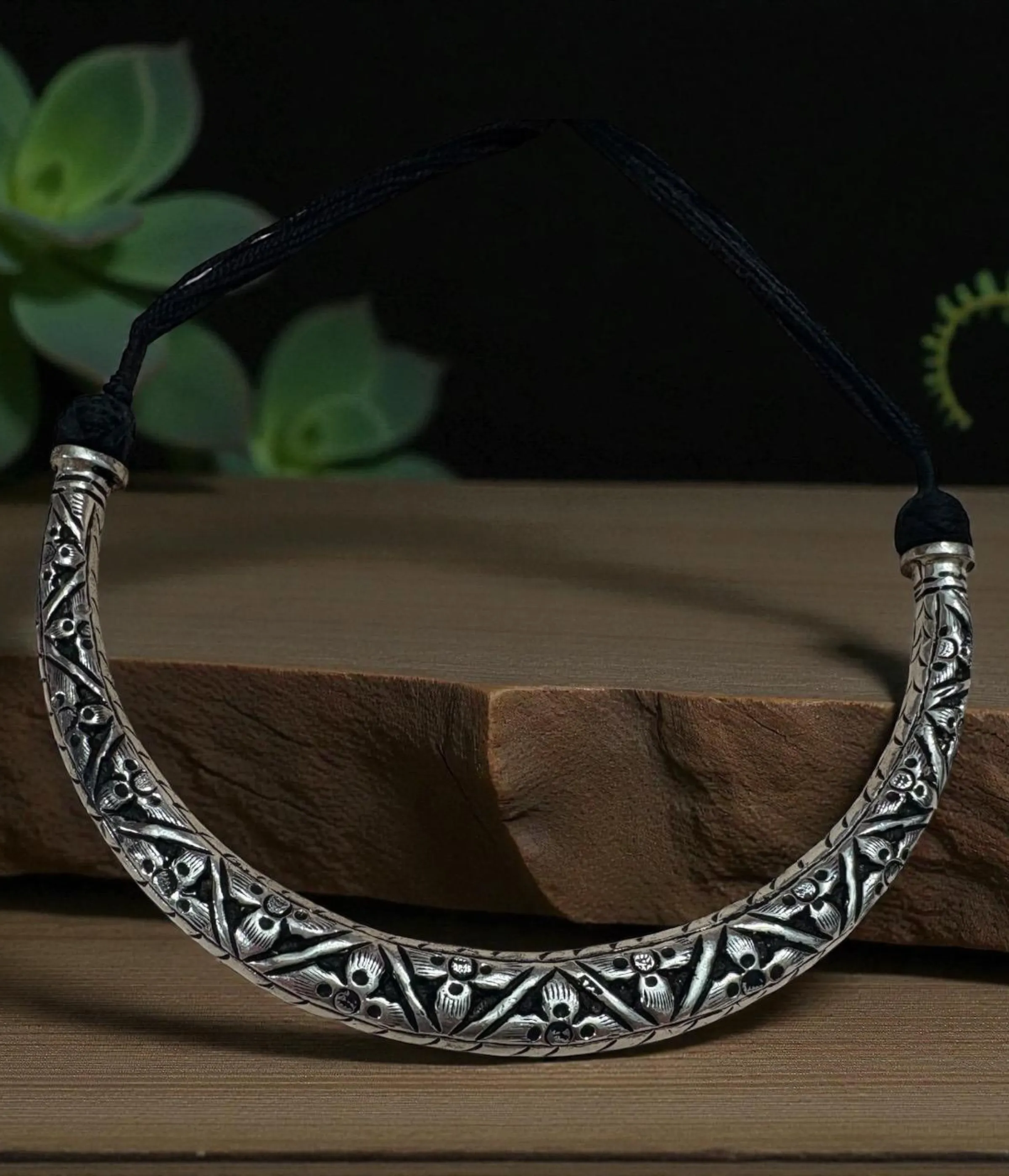 Authentic Oxidized Silver: This stunning Oxidized Choker is crafted from premium 925 Sterling Silver, giving it that sought-after antique finish that highlights the delicate carving. The sturdy, curved Hasli shape makes it a bold statement piece rooted in traditional ethnic jewelry.