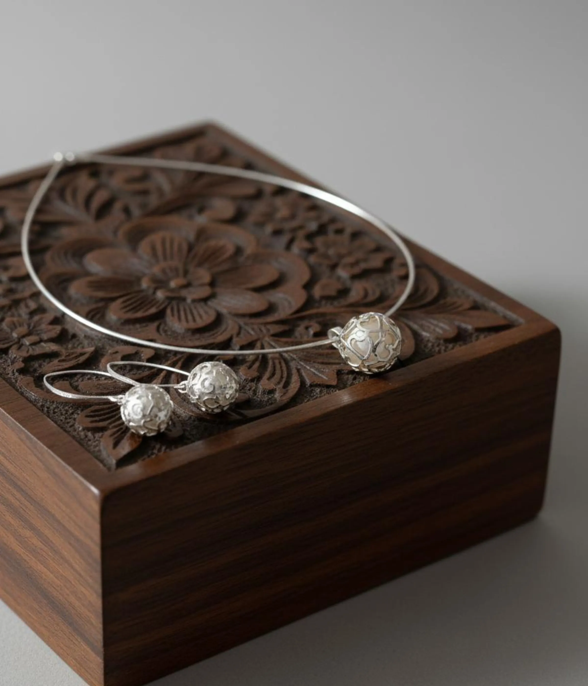 Modern Silver Ball Pendant Set | Intricate Filigree Choker (A-134)