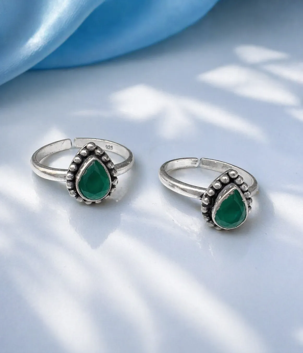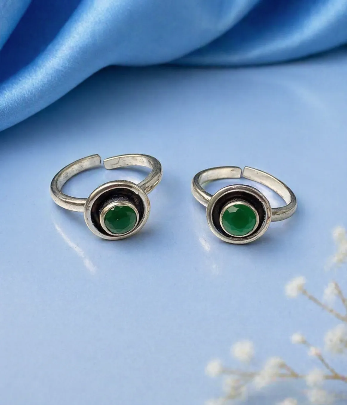 Sterling Silver Adjustable Toe Ring for Women Antique Green Stone Bichhiya (A-239)