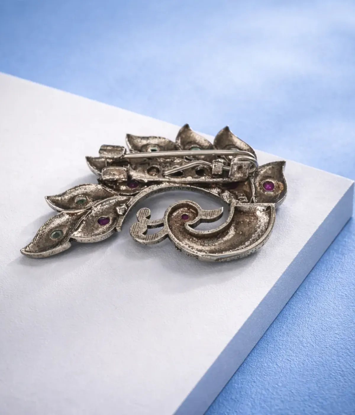 - Product Name: Antique Peacock Oxidised Silver Brooch Pin with Stone Detailing